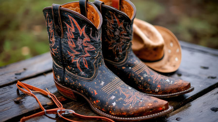 A striking pair of brown cowboy boots with intricate patterns sits alongside a stylish western hat on a rustic wooden surface, embodying cowboy culture.