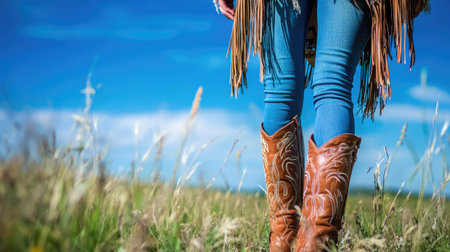 A close-up of a cowgirl's denim jeans, leather boots, and fringe jacket, standing in a field of tall grass under a bright blue sky.