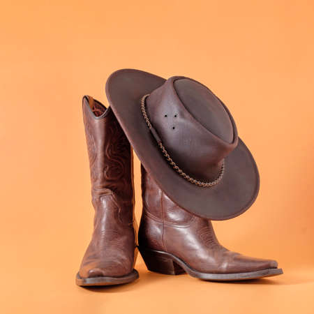 Two elegant classic boots and a leather cowboy hat on an orange clay background. Ranger cowboy concept on a ranch in america usa texas.