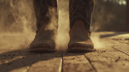 Close-up of dusty cowboy boots standing on a worn wooden floor, capturing the essence of the Western lifestyle with sunlight illuminating the surrounding dust in a rustic setting.