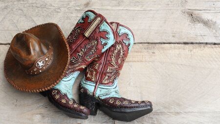 pair of cowboy boots with a cowboy hat close up laying on a wood background