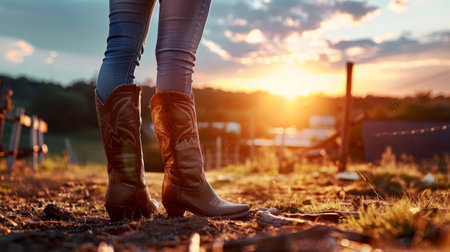 A Ground-Up View of a Girl in Cowboy Boots Basking in the Radiance of the Setting Sun on a Ranch