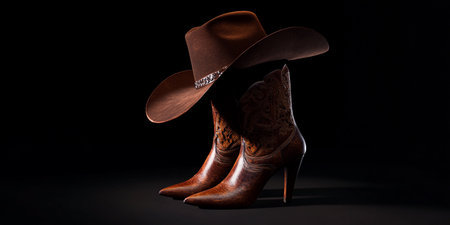 A cowboy hat and boots rest on a dark, textured wooden surface. The hat is a light brown color, and the boots show details. The composition is likely illuminated by soft lighting, suggesting an indoor setting. This image could be suitable for a variety of editorial or commercial purposes.