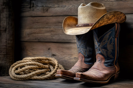 Cowboy hat resting on worn leather boots with lasso on rustic wooden background evokes the spirit of the wild west