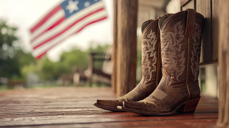 Modern Cowboy Boots Resting on Wooden Porch with American Flag in Background. Concept of Texas Independence Day, Western Style, Patriotism. Copy space.
