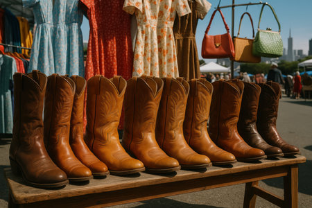 Vintage leather cowboy boots arranged in a row on a wooden table at an outdoor market with retro dresses and handbags displayed.