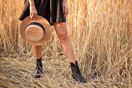 Young woman in black dress standing in field with wheat and holding a hat in her hand