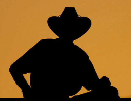 A cowboy stands silhouetted against a vibrant sunset over a dry grassy field