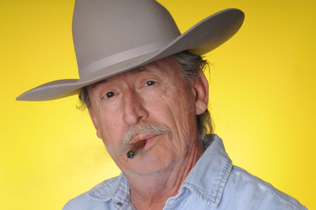 Handsome guy with confident face. Close up young man smoking a cigarette, cigar. Handsome man wear cowboy hat.