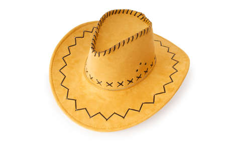 American cowboy wear, western design and country fashion conceptual idea with folded pair of black denim jeans and brown cowboy hat isolated on white background