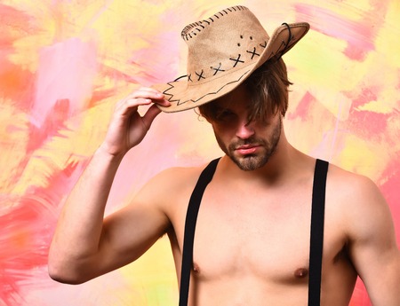 Bearded man, short beard. Caucasian sexy macho man with moustache shows muscle torso on athletic body in pants with suspenders and cowboy hat on colorful studio background