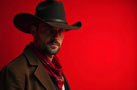 A man dressed in traditional cowboy attire stands against a vibrant red background. His expression is serious, featuring a wide-brimmed hat and a stylish scarf, exuding confidence and charm..