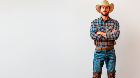 cowboy couture. Vintage style man. Wild West retro cowboy. wild west rodeo. Handsome man in hat. man checkered shirt on ranch. cowboy in country side. Western. western cowboy portrait