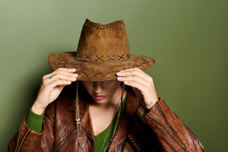 Brunette woman adjusts her cowboy hat while wearing a stylish leather jacket in a cozy setting.