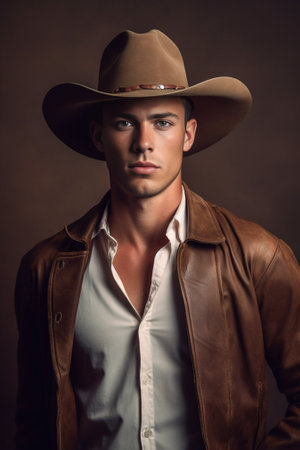 A cowboy poses confidently, showcasing his piercing blue eyes and strong facial features. The dramatic lighting enhances his rugged look, emphasizing the textures of his attire and hat.