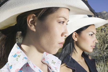 Portrait of two beautiful women in cowboy hats on a bokeh background
