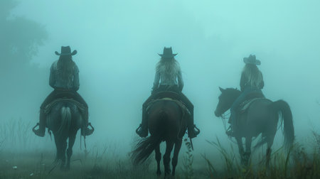 Three women riding horses with cowboy hats on misty field backdrop.