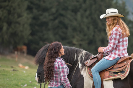 Young woman experiencing the thrill of horseback riding, guided by a calm and confident female instructor through a stunning mountain backdrop