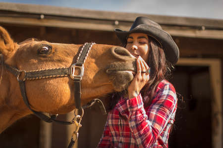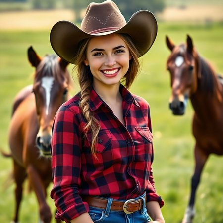 Beautiful cowgirl in cowboy hat and checkered shirt with horses