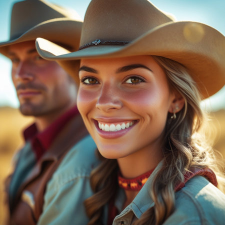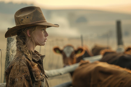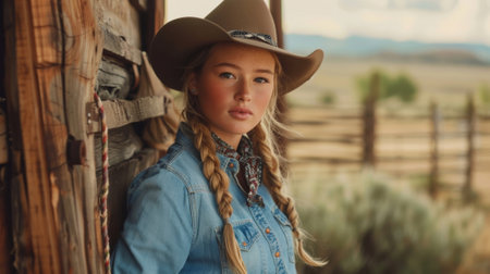 Confident female cowboy, adorned with hat and bandana, stands in rustic outdoor environment, highlighting her unique style and connection to western heritage