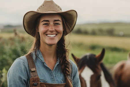 Happy and beautiful portrait of a farmer cowboy woman with her trusted horse, embodying work, connection to land, and rural lifestyle. generative AI
