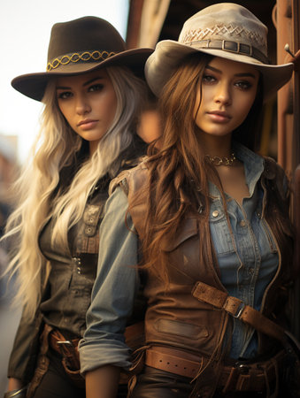 Lesbian couple in cowboy outfits posing for the camera