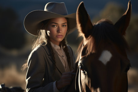 Young cowgirl woman in cowboy hat looking confidently at camera. horizontal photo