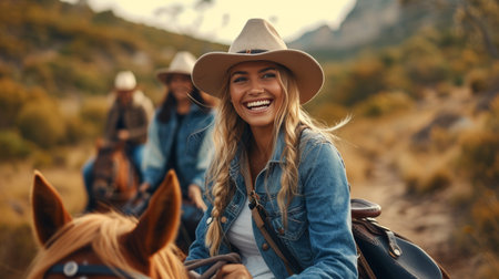 A group of friends laughing joyfully as they ride their horses along a scenic trail.