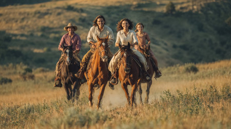 Four horseback riders galloping across golden prairie landscape at sunset with warm lighting and rolling hills in cinematic western adventure scene.
