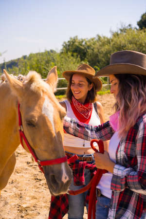 Two cowgirl women stroking a horse on a horse riding, with South American outfits