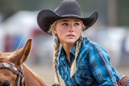 Portrait of a beautiful young woman wearing a cowboy hat on the rodeo