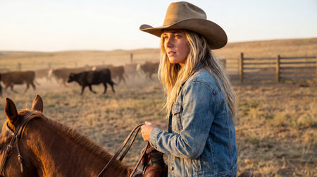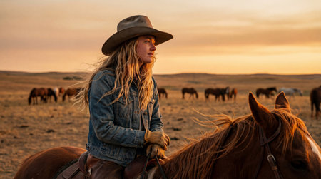 Female cowboy riding horse at sunset on open prairie, thoughtful woman in denim jacket watching distant grazing herd.