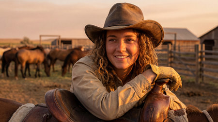 Confident young cowgirl resting on saddle at rural ranch during golden hour sunset with horses grazing in wooden corral background.