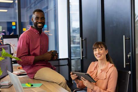 Portrait of happy caucasian male and female colleague standing at desk smiling, woman holding tablet. working in business at a modern office.