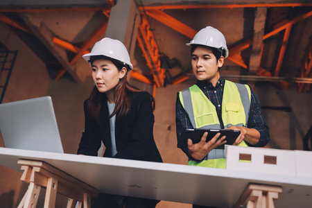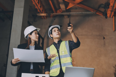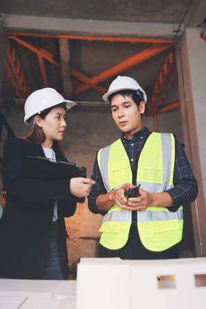 Asian engineer foreman worker man and woman working at building construction site use laptop and talking with radio, engineering hold computer and radio discuss and control worker employee to building