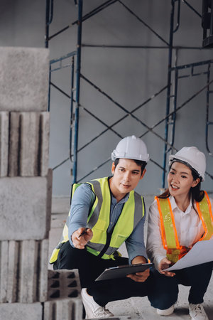 engineers team are discussing while inspecting at construction site, multiracial business engineering man and woman are working outdoors in the urban