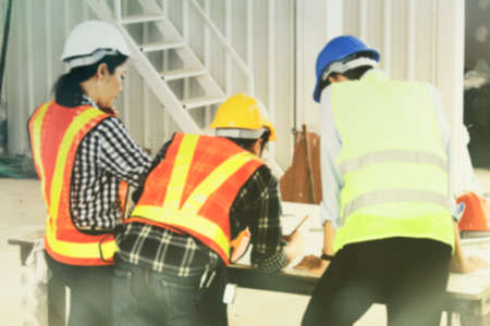 Blur image Back view, three-person teamwork, a group of engineers and construction architects, planning, working together as a new project team in the field in the modern building : Blurred background