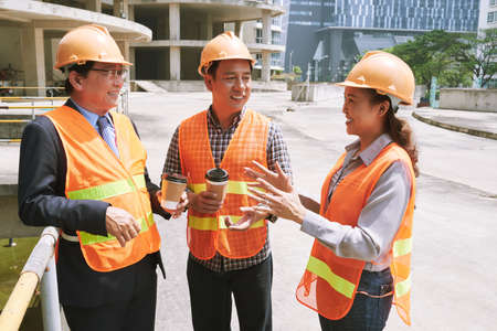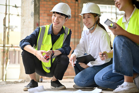 A professional asian female architect having a meeting with her civil engineer and construction inspector at the construction site.