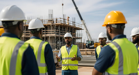 Construction crew meeting at site featuring multiracial team in safety gear with machinery.