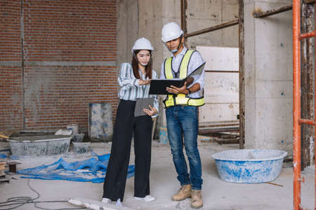 Female industrial engineer wearing a white helmet while standing in a construction site with businessman talking on working plan, Engineer and architects at construction site concept
