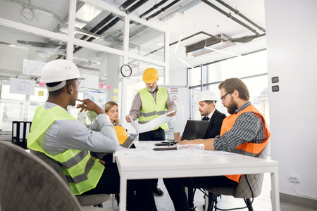 Group of five international partners having working meeting to discuss design and measurements of new building. Teamwork and brainstorming concept.