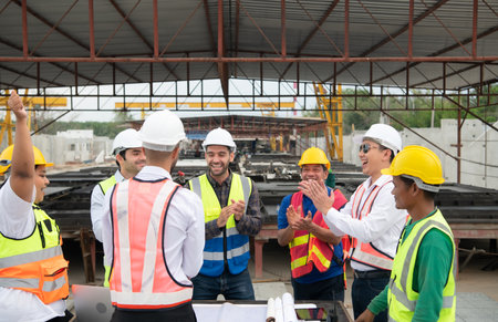 Construction engineers, architects, and foremen form a group. Participate in a meeting to plan new construction projects. Cheers to express happiness that the event was successfully accomplished.