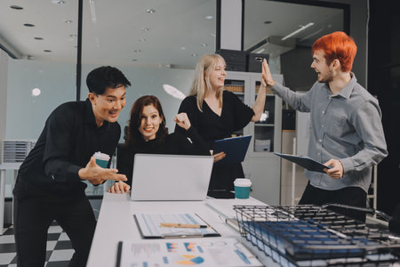 Business professionals collaborating and celebrating success in a modern office environment during the afternoon