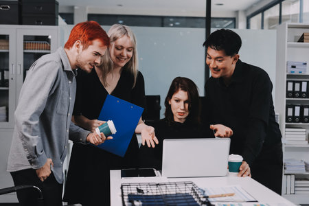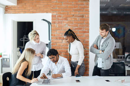Group of mixed race business people working on project, discussing ideas and making suggestions. Digital marketing team using laptop computer and discussing customer focused content in office meeting