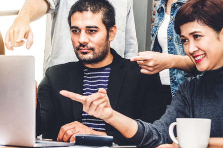 Group of casual business discussing and working with laptop computer.creative business people planning and brainstorm in modern workloft.Teamwork concept