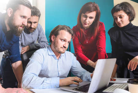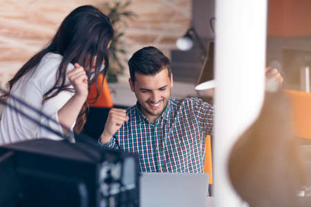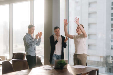Happy business team young men looks at the laptop screen waiting for the results and after receiving a positive result begin to rejoice. Concept of teamwork young startupers.