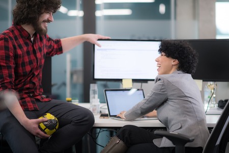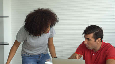 Young couple working together on a laptop in the office. Teamwork concepts.