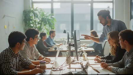 Group of young multiracial people in casual discussing strategy plan of collaboration standing at table in modern office
