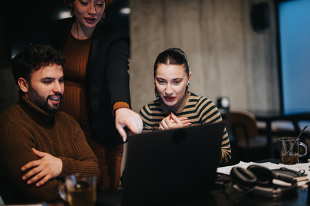 Group of coworkers using laptop in dark office. Professional focused businessman and businesswomen working with laptop computer late at night. Business and technology concept