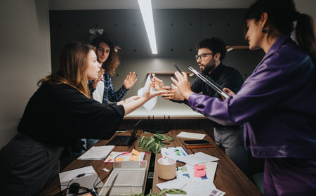 Group of young businesspersons having discussion and sharing opinions in meeting at office